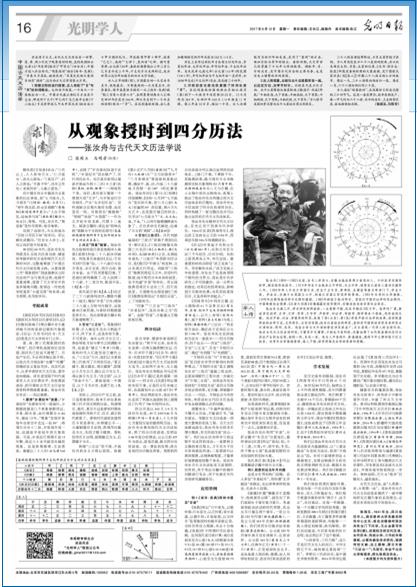 《光明日报》2017年6月12日第十六版“光明学人”整版刊发了贵州大学张闻玉教授撰写的《从观象授时到四分历法——张汝舟与古代天文历法学说》,介绍了张汝舟先生在中国古代天文历法方面的学术成果和影响。