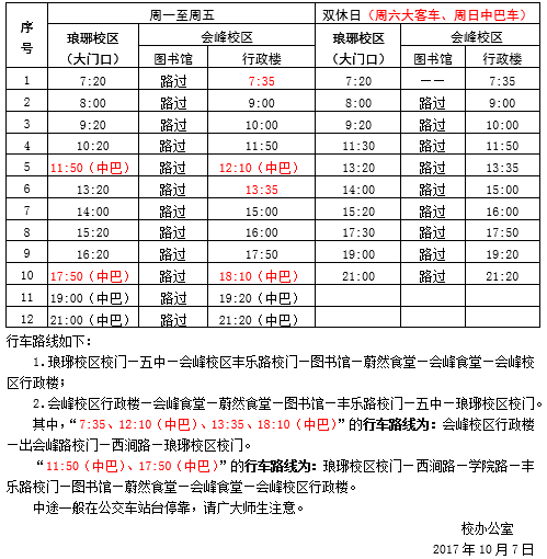 365bet真人体育交通车运行时刻表(2017年10月9日起执行)