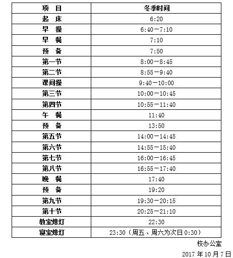 365bet真人体育作息时间表(2017年10月9日起执行)