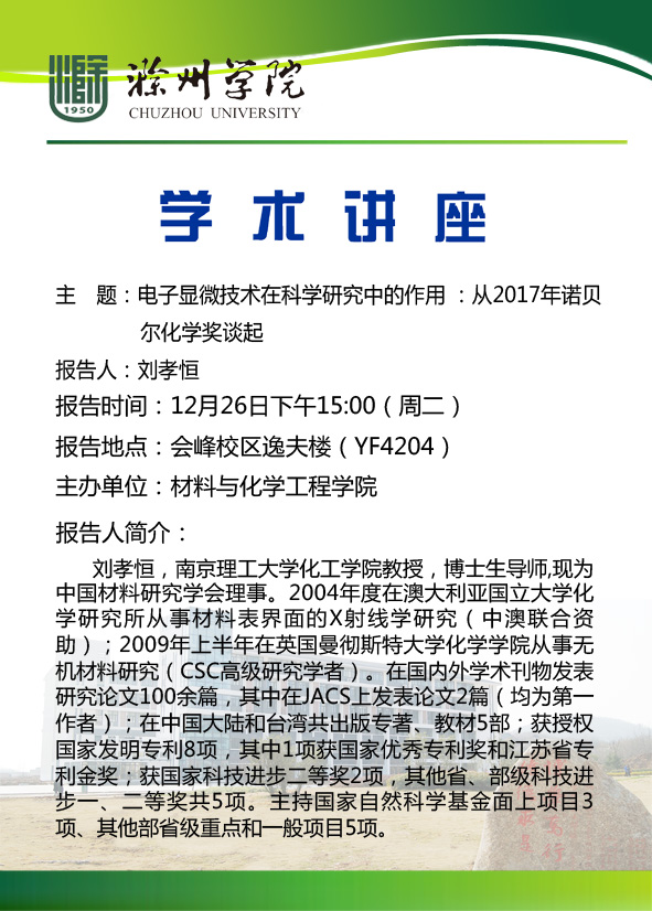 【学术讲座】刘孝恒:电子显微技术在科学研究中的作用:从2017年诺贝尔化学奖谈起