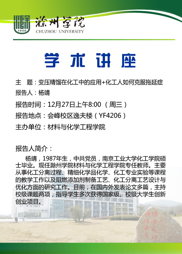 【学术讲座】杨靖:变压精馏在化工中的应用+化工人如何克服拖延症
