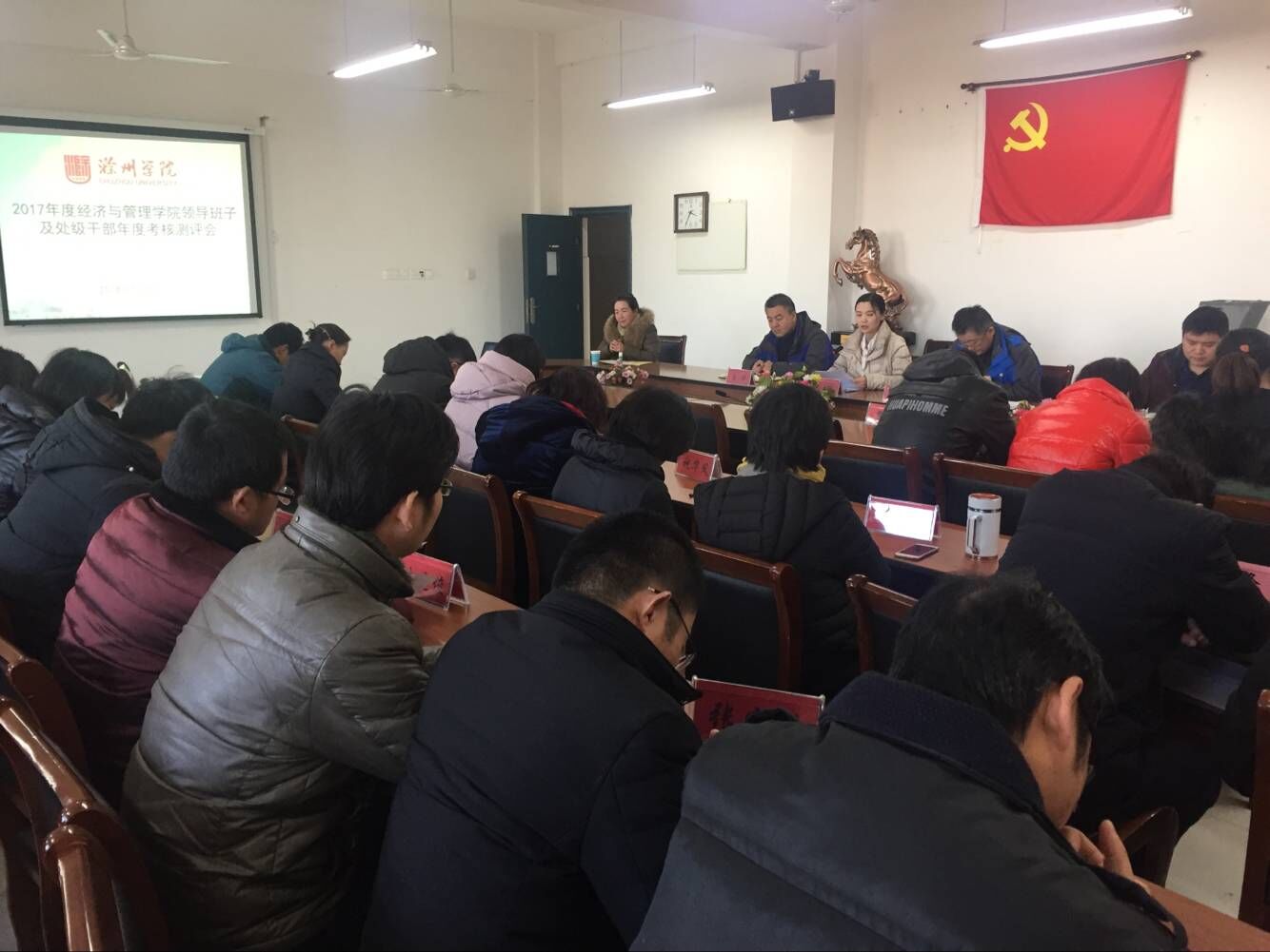 1月10日,经济与管理学院召开2017年度经管学院领导班子及处级干部考核大会暨教职工考核动员会,学院党总支记奚昕、院长史贤华、副书记朱鹤鸣、副院长王琦和校人事处何翠屏老师及全院全体教职工参加了会议,会议由院长史贤华主持召开。
