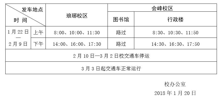 2018年寒假和春节期间交通车运行时刻表